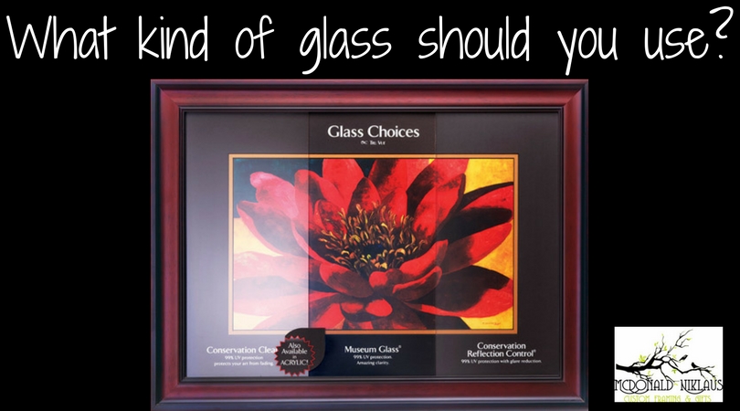 There are a couple critical parts of custom framing, and everyone loves to spend time picking out their frames and mats, but we rarely have customers who have given a lot of thought to their choice of glass. Here at McDonald Niklaus, we use a variety of different glasses and acrylics in our custom framing because each provide a different set of advantages at different price points. Here’s a quick run down: